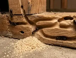 Carpenter ant damage shows clean, smooth galleries with sawdust-like frass outside. Termite damage is rougher and packed with soil or frass inside the galleries. Carpenter ants are larger and visible; termites are rarely seen directly. A free inspection from Bugsy’s will identify which pest is present.